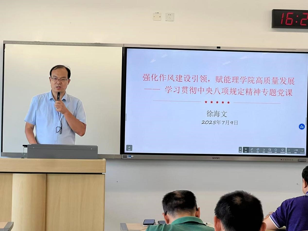 本网讯李元报道:2025年7月9日,理学院围绕“强化作风建设引领、赋能高质量发展”主题,召开学习贯彻中央八项规定精神专题党课。学院党委主要负责同志、院长徐海文授课,学院班子成员、各系室主任、党支部书记及支委参加学习。
